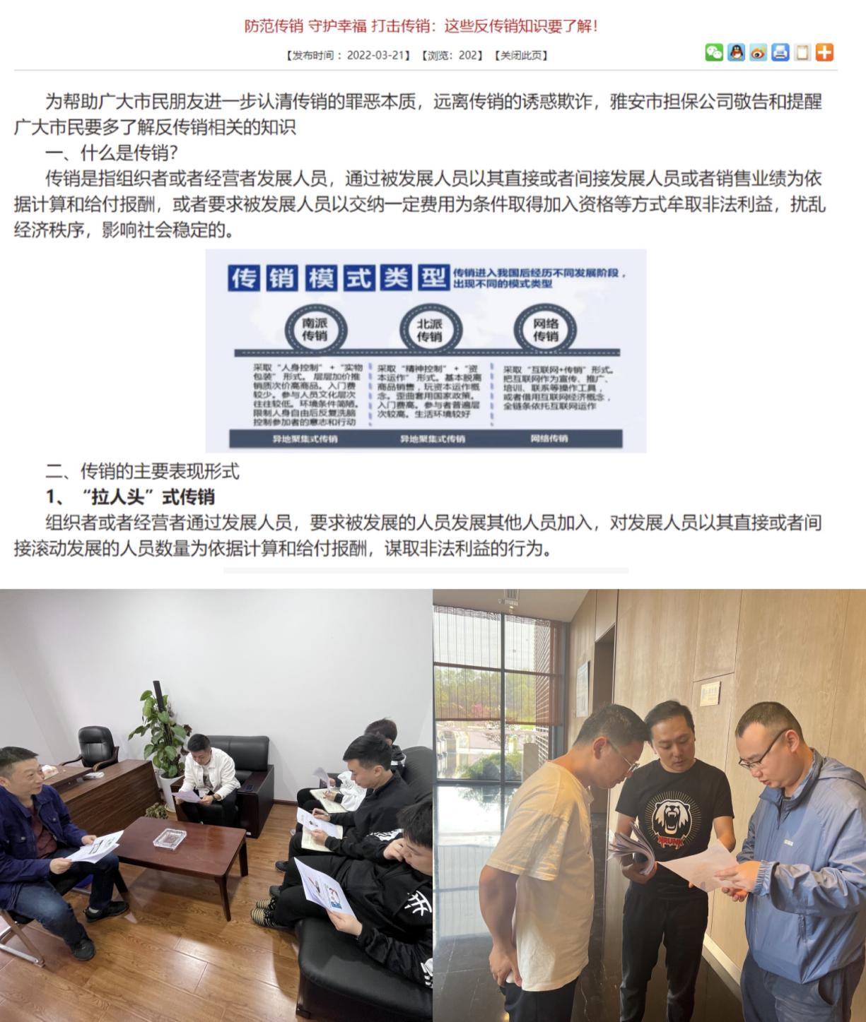 在打擊傳銷“宣傳教育周”活動(dòng)中,市擔(dān)保公司一方面通過(guò)官網(wǎng)、微信群、分組學(xué)習(xí)等方式,積極向員工宣傳打擊傳銷知識(shí);另一方面利用外出辦理業(yè)務(wù)的機(jī)會(huì),廣泛地向公司客戶宣傳禁止傳銷的法律法規(guī)。實(shí)現(xiàn)了多渠道、多層面、多角度、多形式開展宣傳警示活動(dòng),揭露傳銷行為的欺騙本質(zhì)和危害性,增強(qiáng)干部職工及客戶辨識(shí)、防范傳銷能力,提高自我防護(hù)意識(shí),營(yíng)造全社會(huì)共同參與打擊傳銷的氛圍,維護(hù)社會(huì)和諧穩(wěn)定,為我市經(jīng)濟(jì)社會(huì)全面協(xié)調(diào)發(fā)展服務(wù)。