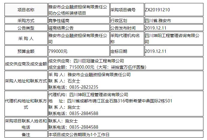 雅安市企業(yè)融資擔保有限責任公司辦公場所裝修項目競爭性磋商結(jié)果公告